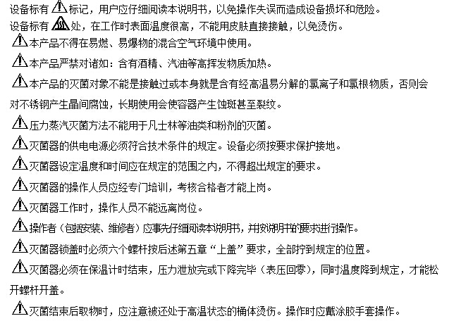 標記,表示在工況條件下滅菌器表面溫度很高,使用時請操作者的人體肌膚不能直接接觸桶體,以防燙傷;