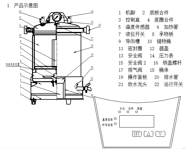 “水位”指示燈:通電后,在桶內沒有水(或水位低于保護低水位)時該燈亮,顯為紅色,同時機內蜂鳴器鳴叫;當桶內的水位高于低水位時,指示燈轉為綠色,可以進入加熱狀態。但是,這并非表示桶內的水量可以滿足整個滅菌程序的需要。滅菌起始水位一定要按示意圖的要求加到規定的位置。