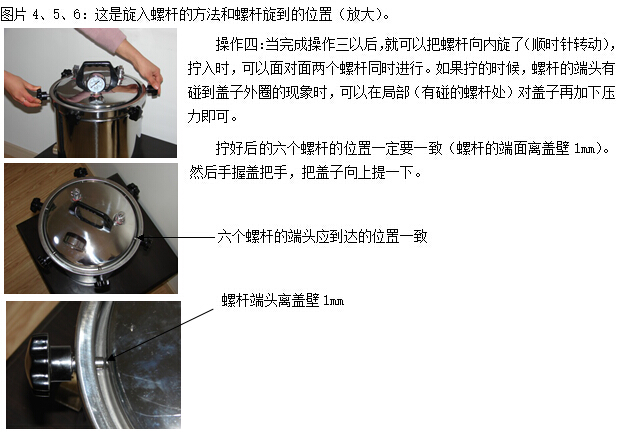 c 適當退出已經擰在滅菌器桶口邊上的膠木螺釘,使螺釘端頭離開器蓋的邊緣,然后小心提起器蓋。切勿使用提拉放汽管的方法提起器蓋。