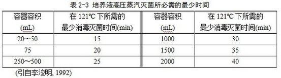 滅菌器內(nèi)冷空氣,以便使蒸汽能到達(dá)各個(gè)消毒部位,保證消毒滅菌徹底。然后繼續(xù)加壓加熱,當(dāng)壓力表讀數(shù)達(dá)到1.0~1.1 kg/cm2為121 ºC,保持15~20 min即可。由于消毒滅菌效果取決于溫度而不是壓力,所以在一定壓力下保持較長(zhǎng)的消毒滅菌時(shí)間是必須的。在121 ºC的蒸汽溫度下可以很快殺死各種細(xì)菌及高度耐熱的芽孢桿菌,因此許多培養(yǎng)液的消毒滅菌壓力、溫度一般保持在1.0~1.1 kg/cm2、121 ºC。消毒滅菌時(shí)間與需要消毒滅菌的培養(yǎng)液量密切相關(guān)(表2-3),時(shí)間不足達(dá)不到滅菌效果,時(shí)間過(guò)長(zhǎng)培養(yǎng)液內(nèi)的一些化學(xué)物質(zhì)遭到破壞,影響培養(yǎng)液成分。消毒滅菌結(jié)束后,關(guān)閉熱源,只有當(dāng)